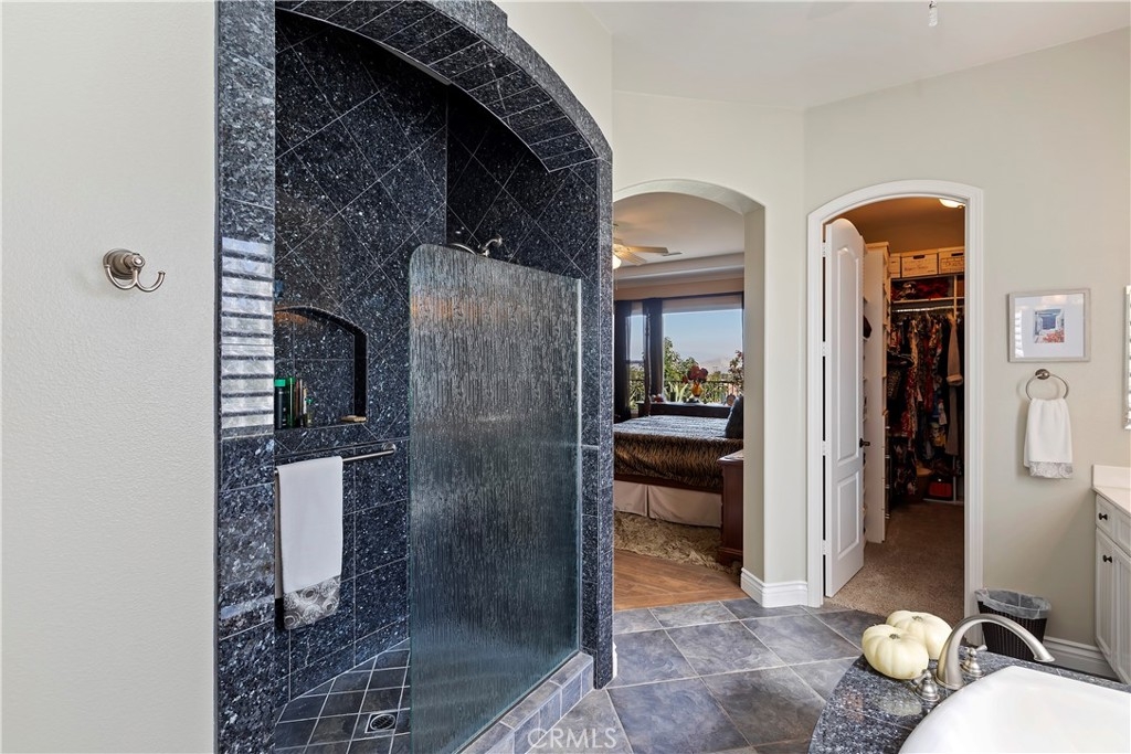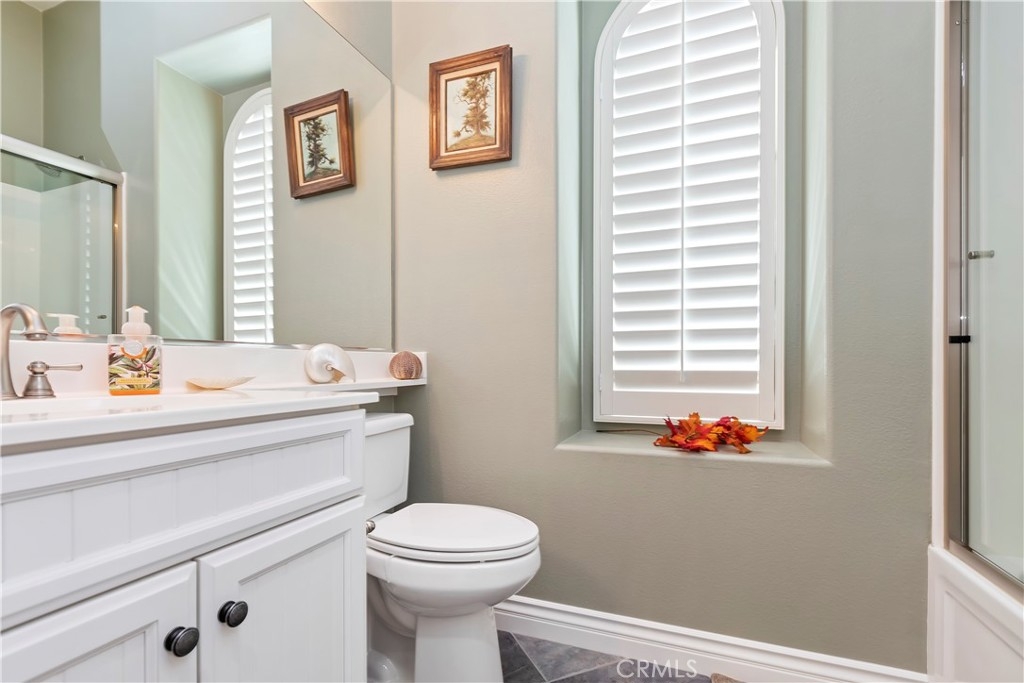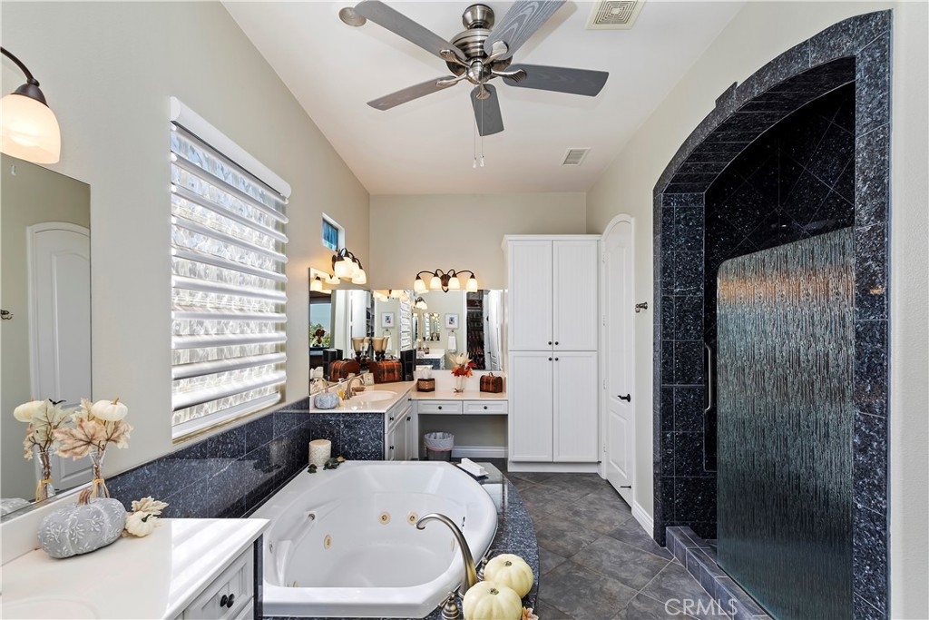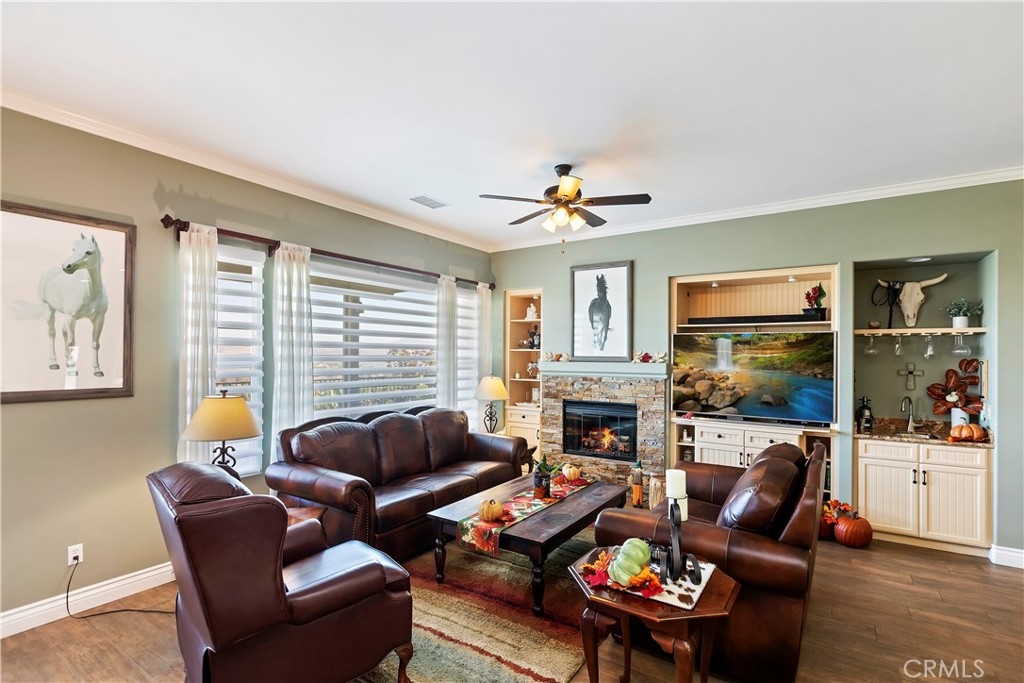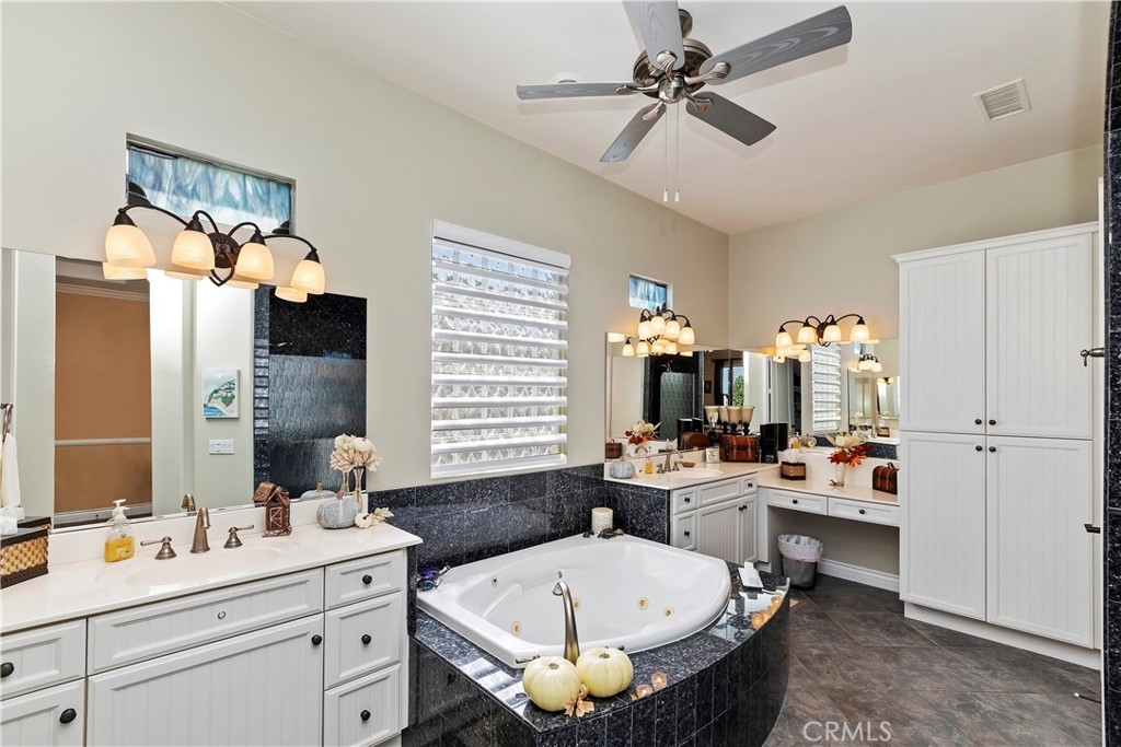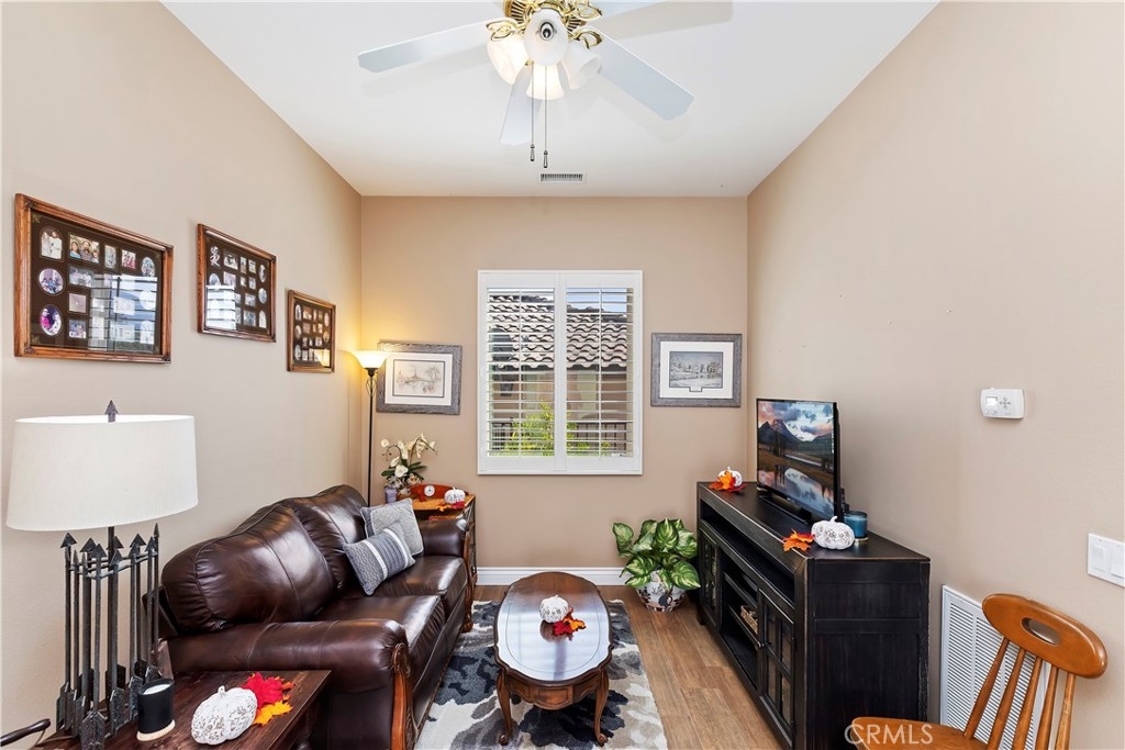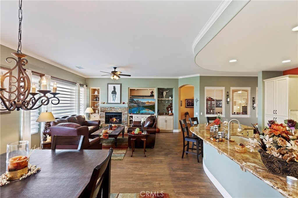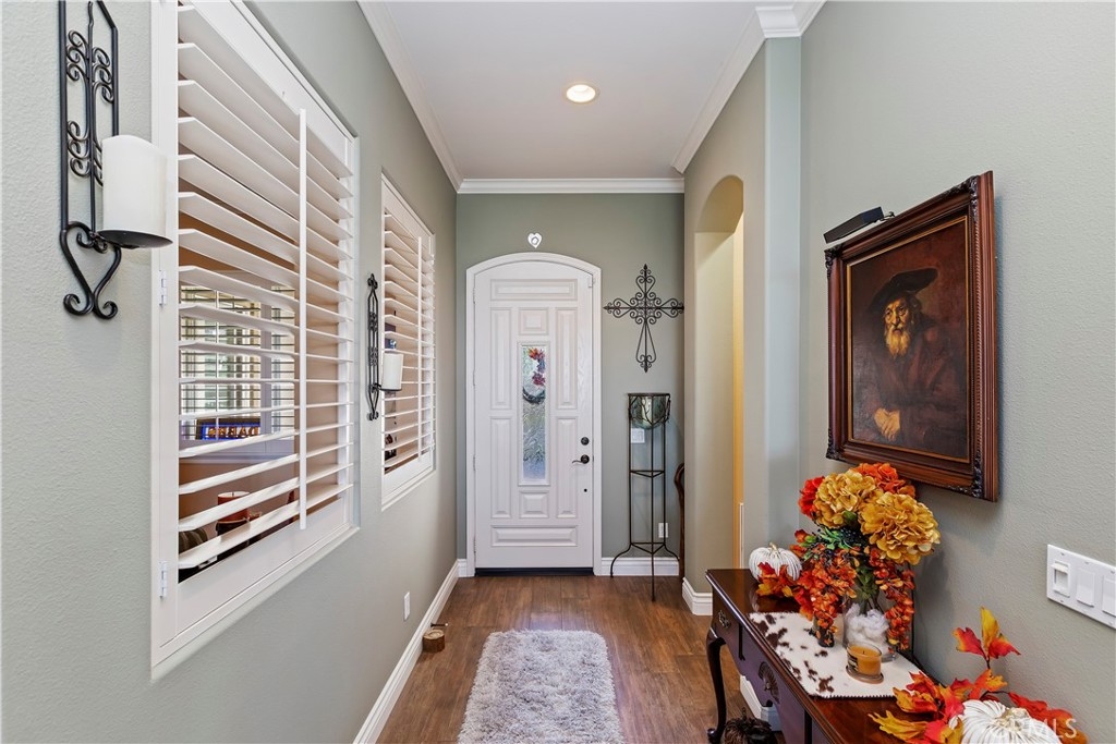 Welcome to the "Best of the Best" located in the beautiful and tranquil 55+ community of Trilogy at Glen Ivy. Surrounded by a Ted Robinson golf course and nestled at the base of the Cleveland National Forest, you couldn't ask for a better location. This gorgeous home has had $150,000 in upgraded amenities added to it. Let's start with the amazing view of city lights all of the way to the mountains. Some of the upgraded amenities include beautifully stained concrete in the entry courtyard that includes an alumawood cover. Once you enter the home you will be greeted by new Cerdomus Italian Porcelain tile that looks just like wood. Then you'll enter the kitchen that opens to the Great room providing the perfect place to entertain family and guest while enjoying the remarkable view through the large window. The expansive kitchen island is topped with an amazing piece granite, which also includes a double oven and convection microwave and gorgeous cabinetry. The Great room offers remote controlled Hunter Douglas Pirouette shades, the fireplace has had stone added to it and surrounded by the custom built in entertainment center with wet bar. There are two sets of French Doors, one leading the the courtyard and one to the backyard. Both of them with remote controlled shades. The master suite also includes a custom built-in cabinets. The En Suite bathroom includes a large jacuzzi tub, separate shower with frameless enclosure. A very unique feature is the homes has a 2 room suite that is perfect for the in-laws, guest or a care giver. Ceiling fans are throughout the home. The backyard is set up with a large alumawood patio cover with ceiling fans affording the perfect place to sit and relax as you enjoy the amazing views. Other great features are the FULLY PAID OFF SOLAR virtually eliminating an Edison Bill. Also included is a Life Source Water System which provides amazing salt free water throughout the home and there is nothing you have to add to the system. The Trilogy community affords homeowners all of the amazing clubs and actives as well as an indoor pool/outdoor pool, indoor walking track, weight and exercise room, Tennis, pickleball, card and board rooms. This has the Home & Community of your dreams.